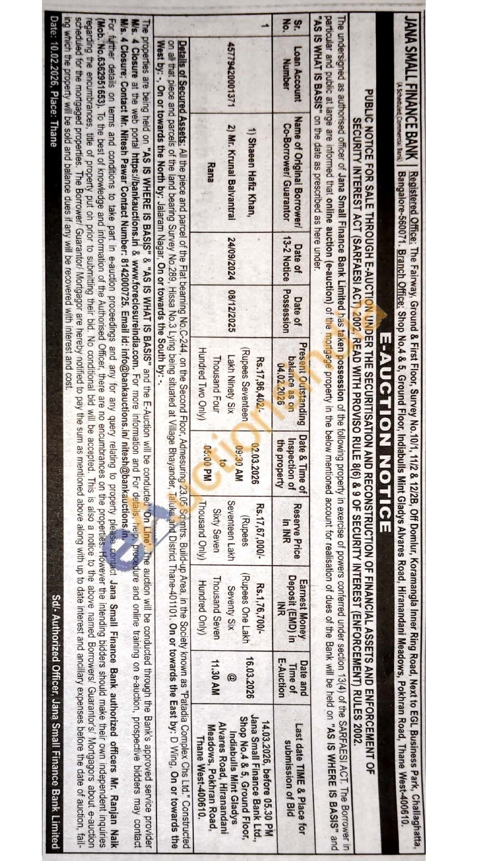 Details of Secured Assets: All the piece and parcel of the Flat bearning No.C-244, on the Second Floor, Admesuring 23.05 Sq.mtrs. Build-up Area, in the Society known as "Patadia Complex Chs Ltd." Constructed all that piece and parcels of the land bearing Survey No.289, Hissa No.3 Lying being situated at Village Bhayander, Taluka and District Thane-401101. On or towards the East by: D Wing, On or towards the on West by:, On or towards the North by: Jalaram Nagar, On or towards the South by: ..