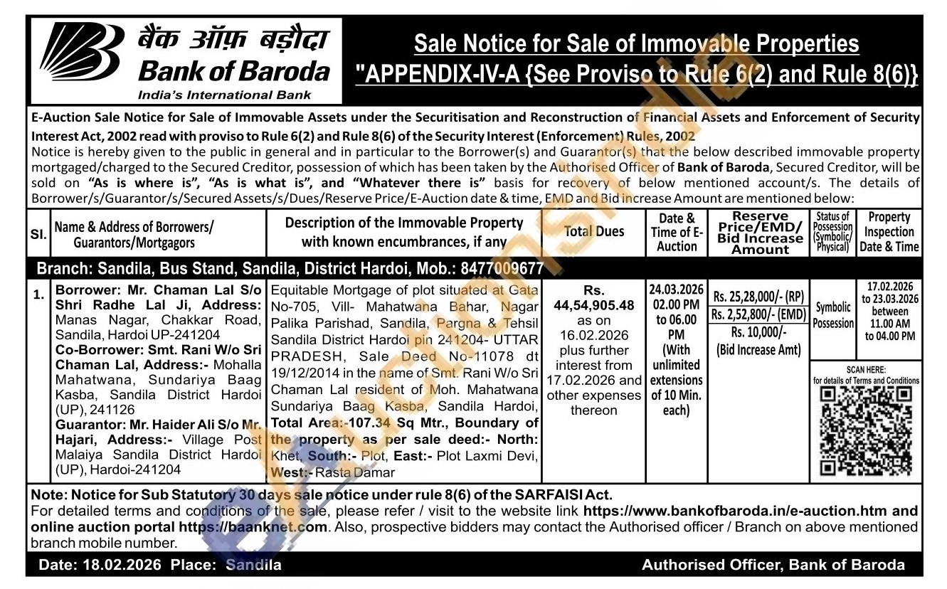 Equitable Mortgage of plot situated at Gata No-705, Vill- Mahatwana Bahar, Nagar Palika Parishad, Sandila, Pargna & Tehsil Sandila District Hardoi pin 241204- UTTAR PRADESH, Sale Deed No-11078 dt 19/12/2014 in the name of Smt. Rani W/o Sri Chaman Lal resident of Moh. Mahatwana Sundariya Baag Kasba, Sandila Hardoi, Total Area:-107.34 Sq Mtr., Boundary of the property as per sale deed: North: Khet, South:- Plot, East:- Plot Laxmi Devi, West:-Rasta Damar