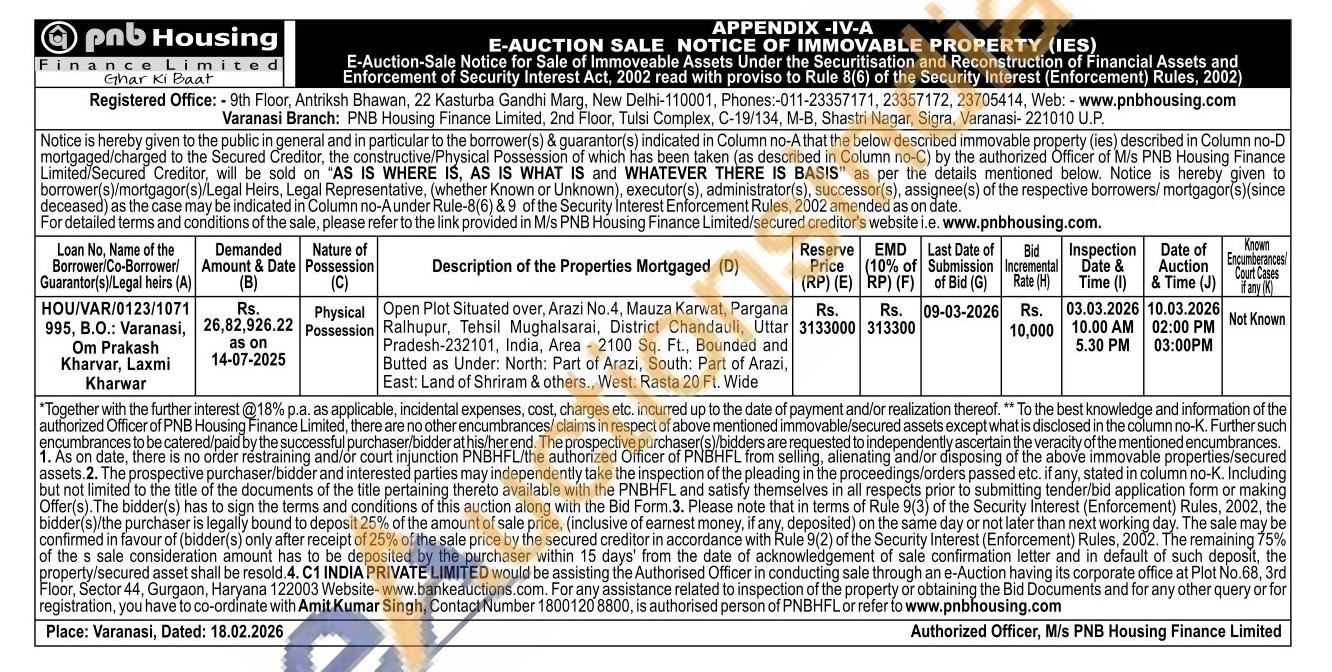 Open Plot Situated over, Arazi No.4, Mauza Karwat, Pargana Ralhupur, Tehsil Mughalsarai, District Chandauli, Uttar Pradesh-232101, India, Area 2100 Sq. Ft., Bounded and Butted as Under: North: Part of Arazi, South: Part of Arazi, East: Land of Shriram & others., West: Rasta 20 Ft. Wide