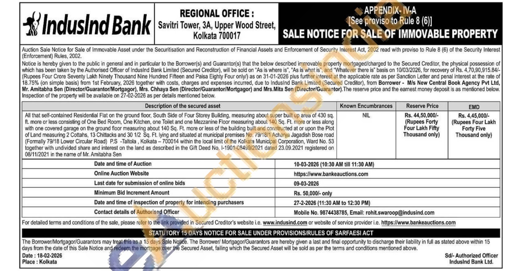 All that self-contained Residential Flat on the ground floor, South Side of Four Storey Building, measuring about super built up area of 430 sq. ft. more or less consisting of One Bed Room, One Kitchen, one Toilet and one Mezzanine Floor measuring about 140 Sq. Ft. more or less along with one covered garage on the ground floor measuring about 140 Sq. Ft. more or less of the building built and constructed at or upon the Plot of Land measuring 2 Cottahs, 13 Chittacks and 30 1/2 Sq. Ft. lying and situated at municipal premises No. 79/18/1 Acharya Jagadish Bose road (Formally 79/18 Lower Circular Road) P.S-Taltola, Kolkata-700014 within the local limit of the Kolkata Municipal Corporation, Ward No. 53 together with undivided share and interest on the land as described in the Gift Deed No. 1-1901-08499/2021 dated 23.09.2021 registered on 08/11/2021 in the name of Mr. Amitabha Sen