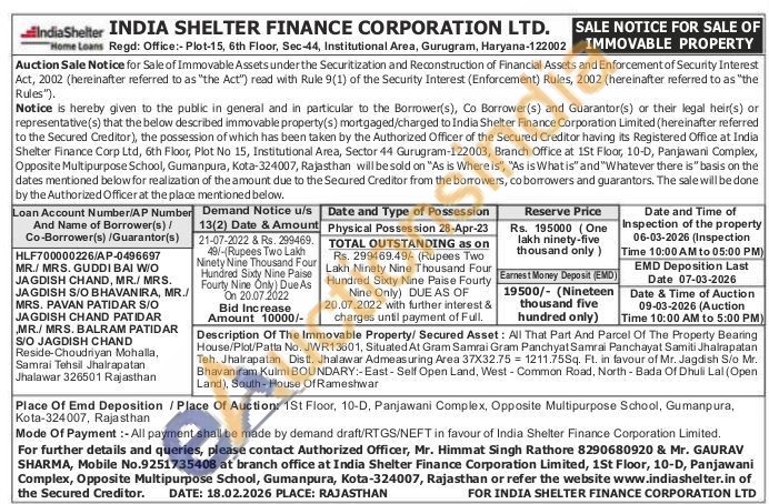 Description Of The Immovable Property/Secured Asset: All That Part And Parcel Of The Property Bearing House/Plot/Patta No. JWR13601, Situated At Gram Samrai Gram Panchyat Samrai Panchayat Samiti Jhalrapatan Teh. Jhalrapatan Distt. Jhalawar Admeasuring Area 37X32.75 1211.75Sq. Ft. in favour of Mr. Jagdish S/o Mr. Bhavaniram Kulmi BOUNDARY:-East-Self Open Land, West-Common Road, North - Bada Of Dhuli Lal (Open Land), South-House Of Rameshwar