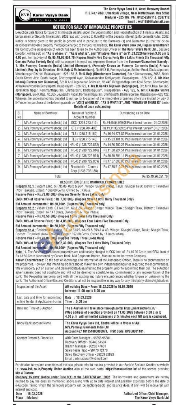 Property No.2: 12: Vacant Land, S.F.No.61/1, 62 & 86, Village Sivagin Village. Taluk: Sivagiri Tauk, District: Tirunelv (Now Tenkasi). Extent: 677.47 Gents, Owned by: Alnico Inbaraj