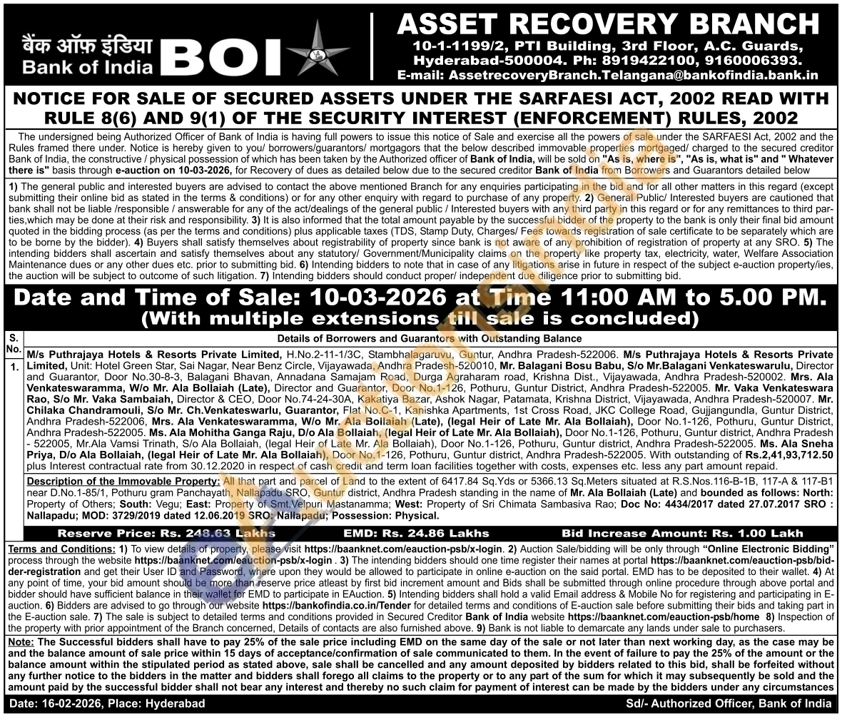 Description of the Immovable Property: All that part and parcel of Land to the extent of 6417.84 Sq. Yds or 5366.13 Sq.Meters situated at R.S.Nos. 116-B-1B, 117-A & 117-81 near D.No.1-85/1, Pothuru gram Panchayath, Nallapadu SRO, Guntur district, Andhra Pradesh standing in the name of Mr. Ala Bollaiah (Late) and bounded as follows: North: Property of Others; South: Vegu; East: Property of Smt. Velpuri Mastanamma; West: Property of Sri Chimata Sambasiva Rao; Doc No: 4434/2017 dated 27.07.2017 SRO: Nallapadu; MOD: 3729/2019 dated 12.06.2019 SRO: Nallapadu