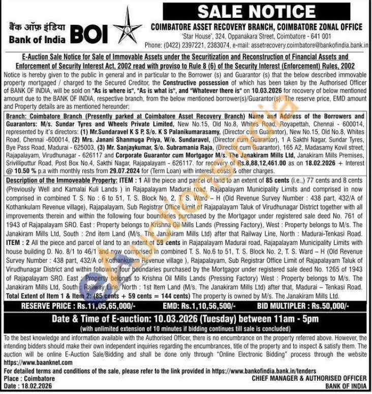 Description of the Immoveable Property: ITEM: 1 All the piece and parcel of land to an extent of 85 cents (i.e.,) 77 cents and 8 cents (Previously Well and Kamalai Kuli Lands) in Rajapalayam Madurai road, Rajapalayam Municipality Limits and comprised in now comprised in combined T. S. No: 6 to 51, T. S. Block No. 2, T. S. Ward-H (Old Revenue Survey Number: 438 part, 432/A of Kothankulam Revenue village), Rajapalayam, Sub Registrar Office Limit of Rajapalayam Taluk of Virudhunagar District together with all improvements therein and within the following four boundaries purchased by the Mortgagor under registered sale deed No. 761 of 1943 of Rajapalayam SRO. East: Property belongs to Krishna Oil Mills Lands (Pressing Factory), West: Property belongs to M/s. The Janakiram Mills Ltd, South: 2nd item Land (M/s. The Janakiram Mills Ltd) after that Railway Line, North: Madurai-Tenkasi Road. ITEM: 2 All the piece and parcel of land to an extent of 59 cents in Rajapalayam Madurai road, Rajapalayam Municipality Limits with house building D. No. 8/1 to 46/1 and now comprised in combined T. S. No.6 to 51, T. S. Block No. 2, T. S. Ward-H (Old Revenue Survey Number: 438 part, 432/A of Kothankulam Revenue village), Rajapalayam, Sub Registrar Office Limit of Rajapalayam Taluk of Virudhunagar District and within following four boundaries purchased by the Mortgagor under registered sale deed No. 1265 of 1943 of Rajapalayam SRO. East: Property belongs to Krishna Oil Mills Lands (Pressing Factory) West: Property belongs to M/s. The Janakiram Mills Ltd, South Railway Line, North: 1st Item Land (M/s. The Janakiram Mills Ltd) after that, Madurai Tenkasi Road. Total Extent of Item 1 & Item 2: (85 cents + 59 cents = 144 cents) The property is owned by M/s. The Janakiram Mills Ltd