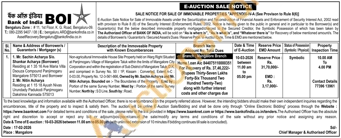 Non-agricultural Immovable House Site Property held on Warg Right Situated at Panjimogaru Village of Mangalore Taluk within the limits of Mangalore City Corporation and within the registration of Sub District of Mangalore Taluk, D.K, and comprised in Survey No. 50/1P, Kissam: Converted, Extent A-C: 0-03.00, Property No. 12-3-561-866, Owned by Mr. Sachin Acharya and Mr. Nitin Acharya. Bounded on: The Boundaries of the Property: East by: Portion of the same Survey Number, West by: Portion of the same Survey Number, North by: SDLine, South by: Road