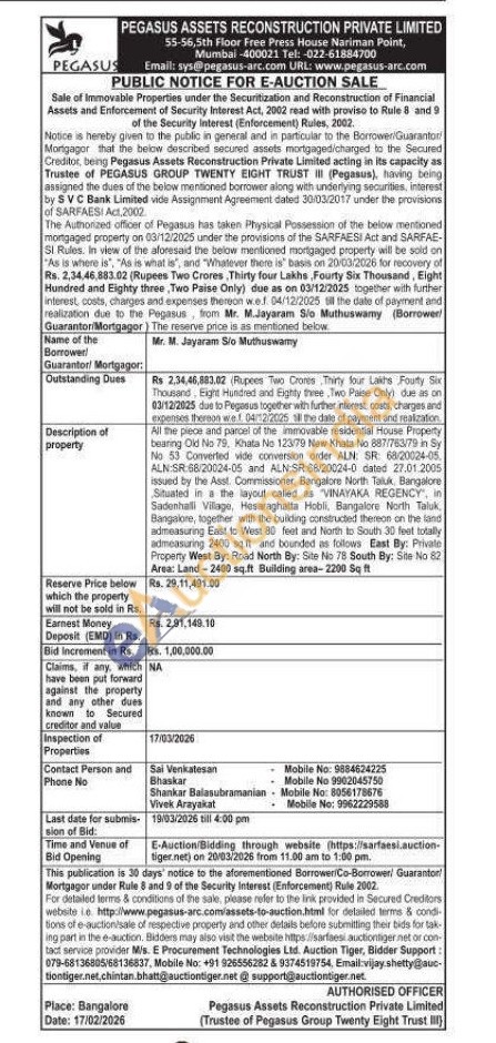 All the piece and parcel of the immovable residential House Property bearing Old No 79, Khata No 123/79 New Khata No 887/763/79 in Sy No 53 Converted vide conversion order ALN: SR: 68/20024-05 ALN:SR:68/20024-05 and ALN:SR 68/20024-0 dated 27.01.2005 issued by the Asst. Commissioner, Bangalore North Taluk, Bangalore Situated in a the layout called as VINAYAKA REGENCY, in Sadenhalli Vilage, Hesaraghalta Hobil, Bangalore North Taluk Bangalore, together with the building constructed thereon on the land admeasuring East to West 80 feet and North to South 30 feet totally admeasuring 2400 sq.ft and bounded as follows East By: Private Property West By: Road North By: Site No 78 South By: Site No 82 Area: Land-2400 sq.ft Building area-2200 Sq ft