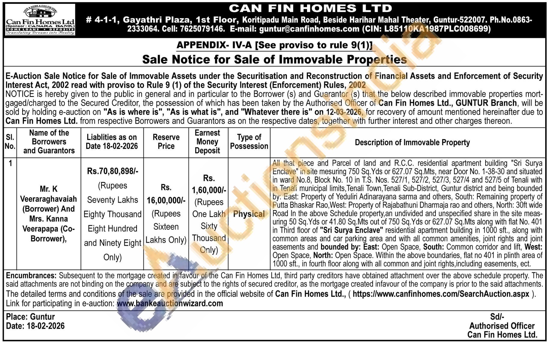 All that piece and Parcel of land and R.C.C. residential apartment building "Sri Surya Enclave" in site mesuring 750 Sq. Yds or 627.07 Sq.Mts, near Door No. 1-38-30 and situated in ward No.8, Block No. 10 in T.S. Nos. 527/1, 527/2, 527/3, 527/4 and 527/5 of Tenali with in Tenali municipal limits, Tenali Town, Tenali Sub-District, Guntur district and being bounded by: East: Property of Yeduliri Adinarayana sarma and others, South: Remaining property of Putta Bhaskar Rao, West: Property of Rajabathuni Dharmaja rao and others, North: 30ft wide Road In the above Schedule property, an undivided and unspecified share in the site meas-uring 50 Sq. Yds or 41.80 Sq.Mts out of 750 Sq. Yds or 627.07 Sq.Mts along with flat No. 401 in Third floor of "Sri Surya Enclave" residential apartment building in 1000 sft., along with common areas and car parking area and with all common amenities, joint rights and joint easements and bounded by: East: Open Space, South: Common corridor and lift, West: Open Space, North: Open Space. Within the above boundaries, flat no 401 in plinth area of 1000 sft., in fourth floor along with all common and joint rights, including easements, ect