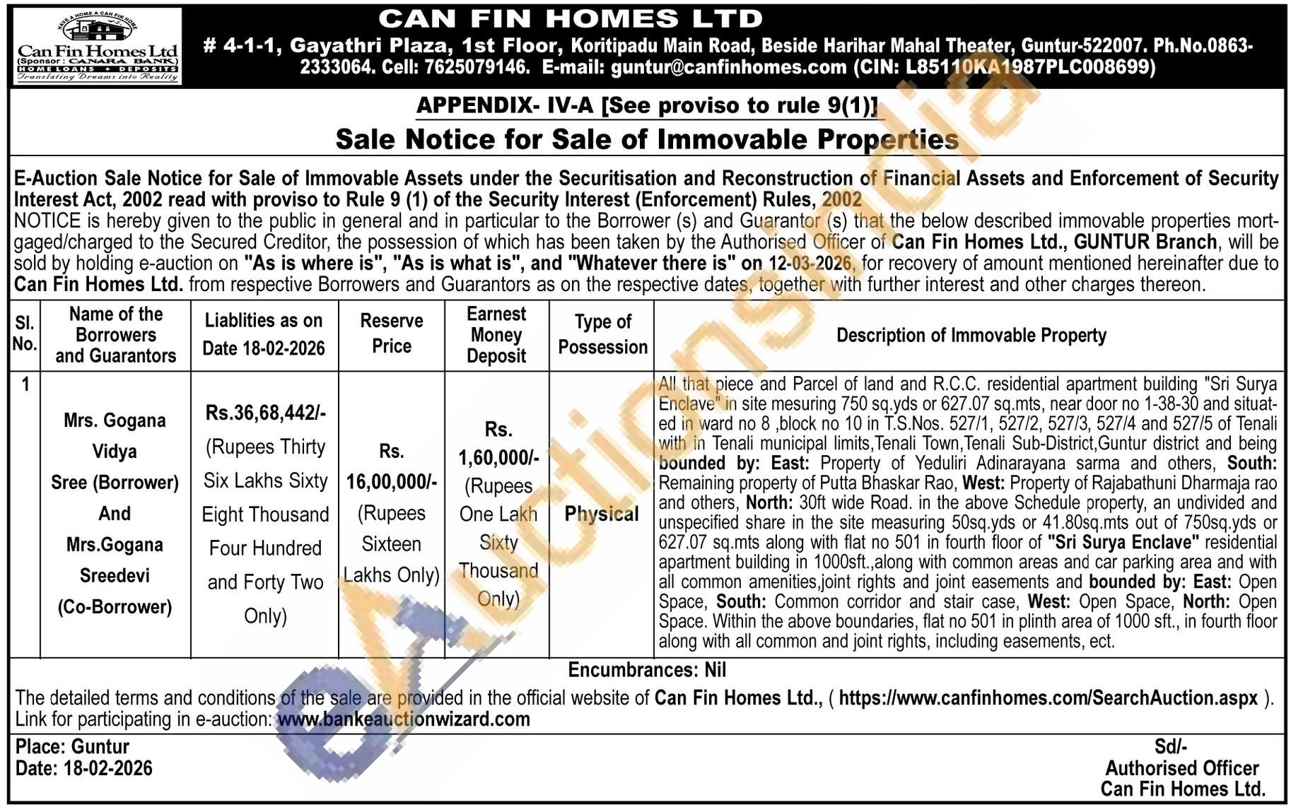 All that piece and Parcel of land and R.C.C. residential apartment building "Sri Surya Enclave" in site mesuring 750 sq.yds or 627.07 sq.mts, near door no 1-38-30 and situat-ed in ward no 8 block no 10 in T.S.Nos. 527/1, 527/2, 527/3, 527/4 and 527/5 of Tenali with in Tenali municipal limits, Tenali Town, Tenali Sub-District, Guntur district and being bounded by: East: Property of Yeduliri Adinarayana sarma and others, South: Remaining property of Putta Bhaskar Rao, West: Property of Rajabathuni Dharmaja rao and others, North: 30ft wide Road. in the above Schedule property, an undivided and unspecified share in the site measuring 50sq.yds or 41.80sq.mts out of 750sq.yds or 627.07 sq.mts along with flat no 501 in fourth floor of "Sri Surya Enclave" residential apartment building in 1000sft., along with common areas and car parking area and with all common amenities, joint rights and joint easements and bounded by: East: Open Space, South: Common corridor and stair case, West: Open Space, North: Open Space. Within the above boundaries, flat no 501 in plinth area of 1000 sft., in fourth floor along with all common and joint rights, including easements, ect