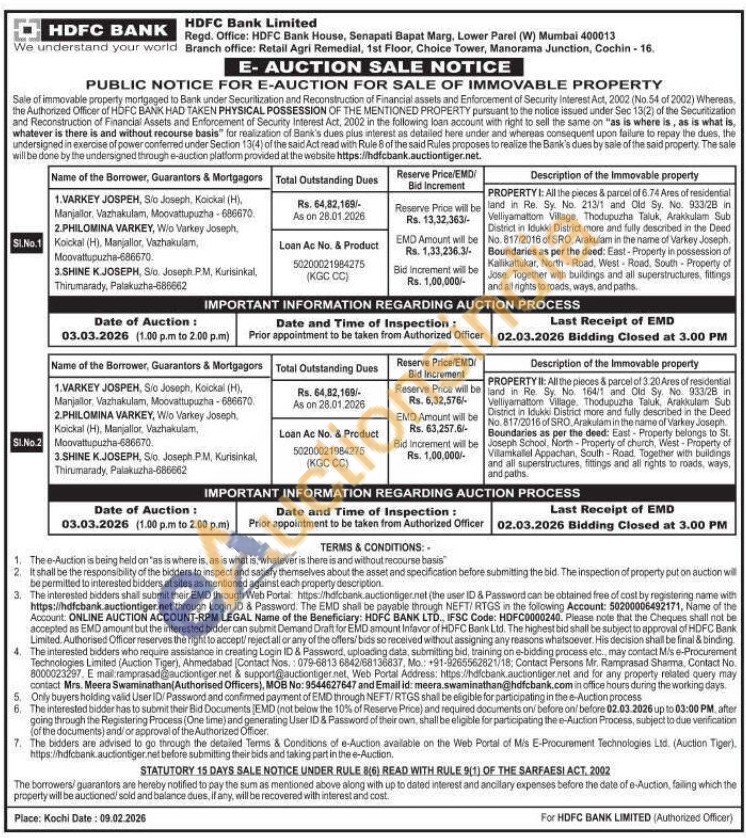 PROPERTY I: All the pieces & parcel of 6.74 Ares of residential land in Re. Sy. No. 213/1 and Old Sy. No. 933/28 in Velliyamattom Village, Thodupuzha Taluk, Arakkulam Sub District in Idukki District more and fully described in the Deed No. 817/2016 of SRO, Arakulam in the name of Varkey Joseph. Boundaries as per the deed: East-Property in possession of Kallikattukar, North-Road, West Road, South-Property of Jose. Together with buildings and all superstructures, fittings and all rights to roads, ways, and paths