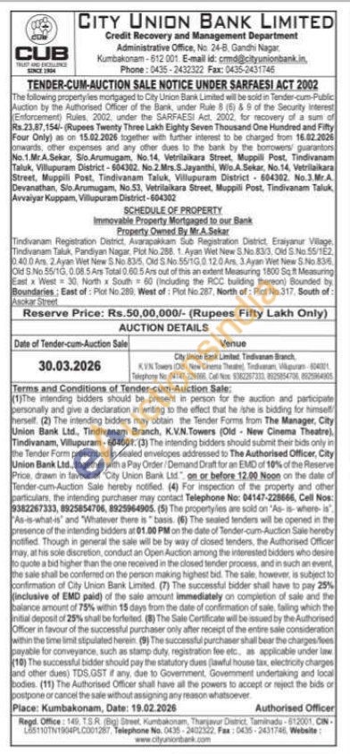 SCHEDULE OF PROPERTY : Immovable Property Mortgaged to our Bank : Property Owned By Mr.A.Sekar : Tindivanam Registration District, Avarapakkan Sub Registration District, Eraiyanur Village Tindivanam Taluk, Pandiyan Nagar, Plot No.288. 1. Ayan Wet New S.No.83/3, Old S.No. 55/1E2 10.40.0 Ars, 2.Ayan Wet New S.No 83/5, Old S.No. 55/1G,0.12.0 Ars. 3. Ayan Wet New S.No.83:6 Old S.No 55/1G,0.08.5 Ars Total 0.60.5 Ars out of this an extent Measuring 1800 Sqft Measuring East x West 30, North x South 60 (Including the RCC building thereon) Bounded by Boundaries: East of: Plot No.289, West of Plot No.287, North of Plot No.317, South of: Asokar Street