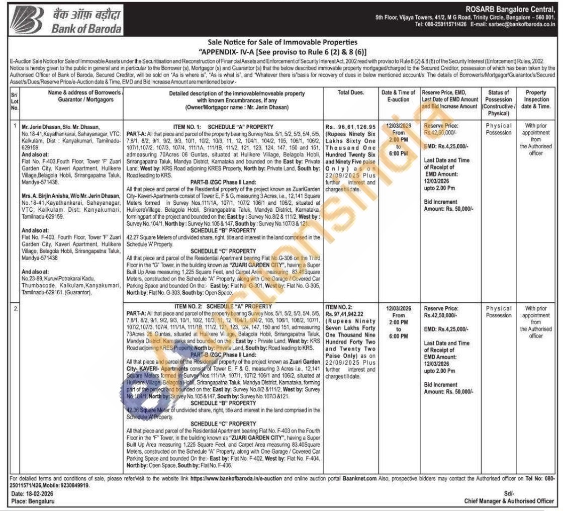 PART-A: All that piece and parcel of the property bearing Survey Nos. 5/1, 5/2, 5/3, 5/4, 5/5, 7,8/1, 8/2, 9/1, 9/2, 9/3, 10/1, 10/2, 10/3, 11, 12, 104/1, 104/2, 105, 106/1, 106/2, 107/1, 107/2.107/3, 107/4, 111/1A, 111/18, 111/2, 121, 123, 124, 147, 150 and 151, admeasuring 73Acres 26 Guntas, siluated at Hulkere Vilage, Belagola Hobili, Srirangapatna Taluk. Mandya District, Kamataka and bounded on the East by: Private Land. West by: KRS Road adjoining KRES Property, North by: Private Land, South by: Road leading to KRSAll that piece and parcel of the Residential property of the project known as Zuari Garden City- KAVERI- Apartments consist of Tower E F & G, measuring 3 Acres ie, 12,141 Square Meters formed in Survey Nos. 111/1A, 107/1, 107/2 106/1 and 106/2, situated at Hulikere Vilage. Belagoia Hobli, Srirangapatna Taluk, Mandya District, Kamataka, forming part of the project and bounded on the: East by: Survey No.8/2 &111/2, West by: Survey No. 104/1, North by: Survey No. 105 &147, South by: Survey No. 107/38121. SCHEDULE "B" PROPERTY 42.36 Square Meter of undivided share, right, title and interest in the land comprised in the Schedule 'A' Property SCHEDULE "C" PROPERTY All that piece and parcel of the Residential Apartment bearing Flat No. F-403 on the Fourth Floor in the "F" Tower, in the building known as "ZUARI GARDEN CITY", having a Super Built Up Area measuring 1,225 Square Feet, and Carpet Area measuring 83.40Square Meters, constructed on the Schedule "A" Property, along with One Garage/Covered Car Parking Space and bounded On the East by: Flat No. F-402, West by: Flat No. F-404, North by: Open Space, South by: Flat No. F-406