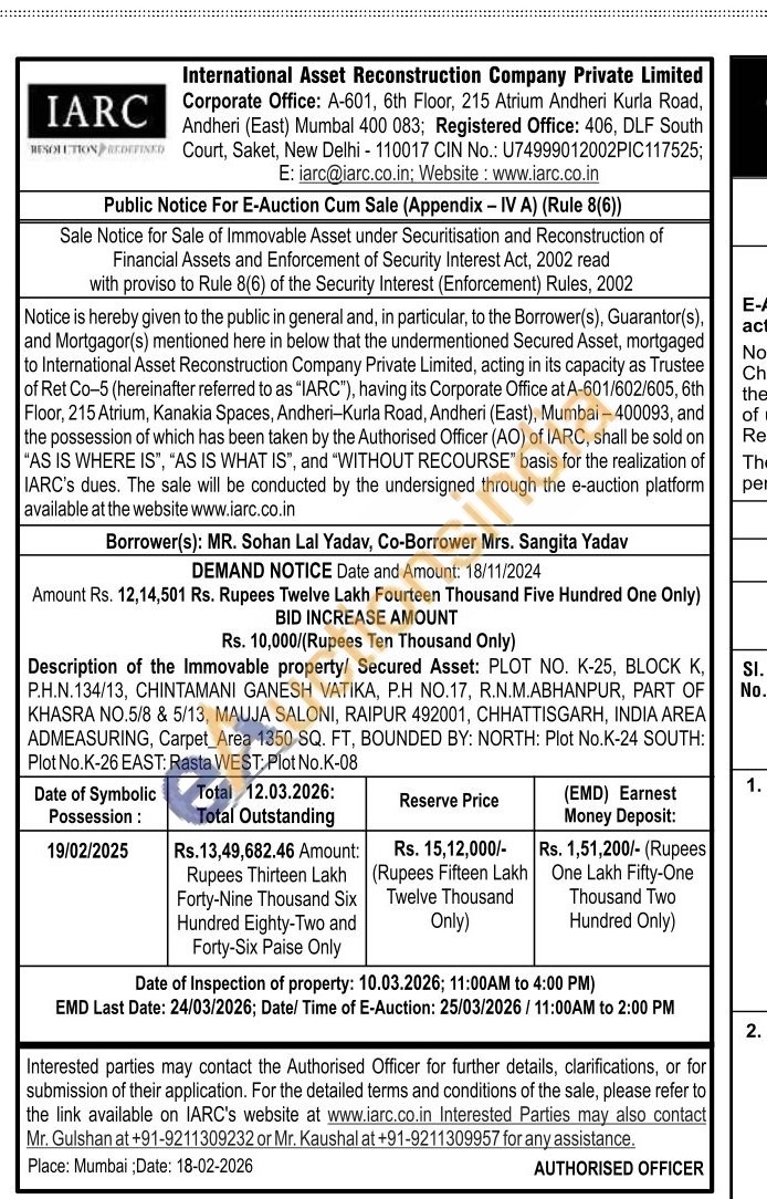 Description of the Immovable property/ Secured Asset: PLOT NO. K-25, BLOCK K, P.H.N.134/13, CHINTAMANI GANESH VATIKA, P.Η ΝΟ.17, R.Ν.Μ.ABHANPUR, PART OF KHASRA NO.5/8 & 5/13, MAUJA SALONI, RAIPUR 492001, CHHATTISGARH, INDIA AREA ADMEASURING, Carpet_Area 1350 SQ. FT, BOUNDED BY: NORTH: Plot No.K-24 SOUTH: Plot No.K-26 EAST: Rasta WEST: Plot No.K-08