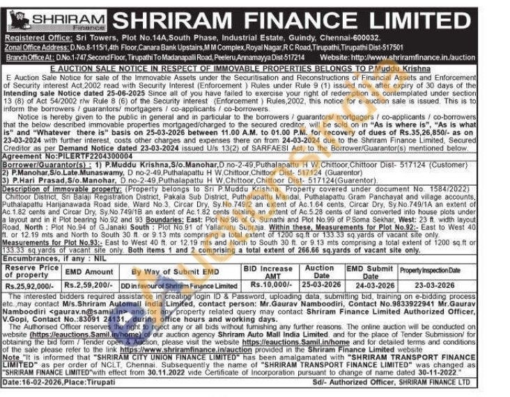 Description of immovable property: (Property belongs to Sri P.Muddu Krishna Property covered under document No. 1584/2022) Chittoor District, Sri Balaji Registration District, Pakala Sub District, Puthalapattu Mandal, Puthalapattu Gram Panchayat and village accounts, Puthalapattu Harijanawada Road side, Ward No.3, Circar Dry, Sy. No.749/2 an extent of Ac.1.64 cents, Circar Dry, Sy. No.749/1A an extent of Ac.1.82 cents and Cirear Dry, Sy. No. 749/18 an extent of Ac. 1.82 cents totaling an extent of Ac.5.28 cents of land converted into house plots under a layout and in it Plot bearing No.92 and 93 Boundaries: East: Plot No.98 of G. Sumathi and Plot No.99 of P.Soma Sekhar, West: 23 ft. width layout Road, North: Plot No.94 of G.Janaki South Plot No.91 of Yallanuru Supraja. Within these, Measurements for Plot No.92:- East to West 40 ft or 12.19 mts and North to South 30 ft. or 9. 13 mts comprising a total extent of 1200 sq ft or 133.33 sq yards of vacant site only. Measurements for Plot No.93: East to West 40 ft or 12.19 mts and North to South 30 ft. or 9.13 mts comprising a total extent of 1200 sq.ft or 133.33 sq yards of vacant site only. Both items 1 and 2 comprising a total extent of 266.66 sq.yards of vacant site only.