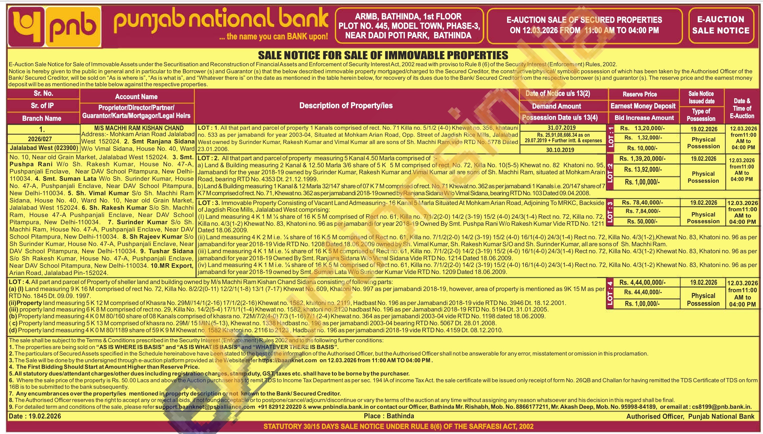 . All part and parcel of Property of sheller land and building owned by M/s Machhi Ram Kishan Chand Sidana consisting of following parts: (a) (1) Land measuring 9 K 16 M comprised of rect No. 72, Killa No. 8/2/2(0-11) 12/2/1(1-8) 13/1 (7-17) Khewat No. 609, Khatoni No. 997 as per jamabandi 2018-19, however, area of property is mentioned as 9K 15 M as per RTD No. 1845 Dt. 09.09. 1997. (ii) Property land measuring 5K 12 M comprised of Khasra No. 29M//14/1(2-16) 17/1/2(2-16) Khewat no. 1582, khatoni no. 2119, Hadbast No. 196 as per Jamabandi 2018-19 vide RTD No. 3946 Dt. 18.12.2001. (iii) property land measuring 6 K8M comprised of rect no. 29, Killa No. 14/2(5-4) 17/1/1(1-4) Khewat no. 1582, khatoni no. 2120 hadbast No. 196 as per Jamabandi 2018-19 RTD No. 5194 Dt. 31.01.2005. Property land measuring 4K0M 80/160 share of 08 Kanals comprised of khasra no. 72M/7/2(4-0) 7/3 (1-16) 7/1 (2-4) Khewat no. 364 as per jamabandi 2003-04 vide RTD No. 1198 dated 18.06.2009. (b) ( c) Property land measuring 5K 13 M comprised of khasra no. 29M/15 MIN (5-13), Khewat no. 1338 Hadbast. no. 196 as per jamabandi 2003-04 bearing RTD No. 5067 Dt. 28.01.2008. d) Property land measuring 4K0M 80/1189 share of 59 K9M Khewat no. 1582 Khatoni no. 2116 to 2123, Hadbast no. 196 as per jamabandi 2018-19 vide RTD No. 4159 Dt. 08.12.2010