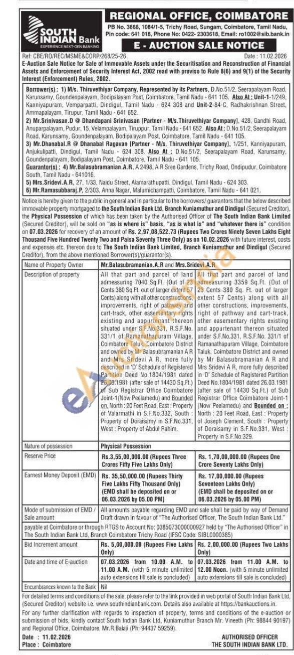 All that part and parcel of land admeasuring 7040 Sq.Ft. (Out of 23 Cents 380 Sq. Ft. out of larger extent 57 Cents) along with all other constructions, Improvements, right of pathway and cart-track, other easementary rights existing and appurtenant thereon situated under S.F.No.331, R.S.F.No. 331/1 of Ramanathapuram Village, Coimbatore Taluk, Coimbatore District and owned by Mr Balasubramanian AR and Mrs Sridevi A R. more fully described in 'D' Schedule of Registered Partition Deed No.1804/1981 dated 26.03.1981 (after sale of 14430 Sq.Ft.) of Sub Registrar Office Coimbatore Joint-1(Now Peelamedu) and Bounded on. North: 20 Feet Road, East: Property of Valarmathi in S.F.No.332, South Property of Doraisamy in S.F.No. 331. West: Property of Abdul Rahim
