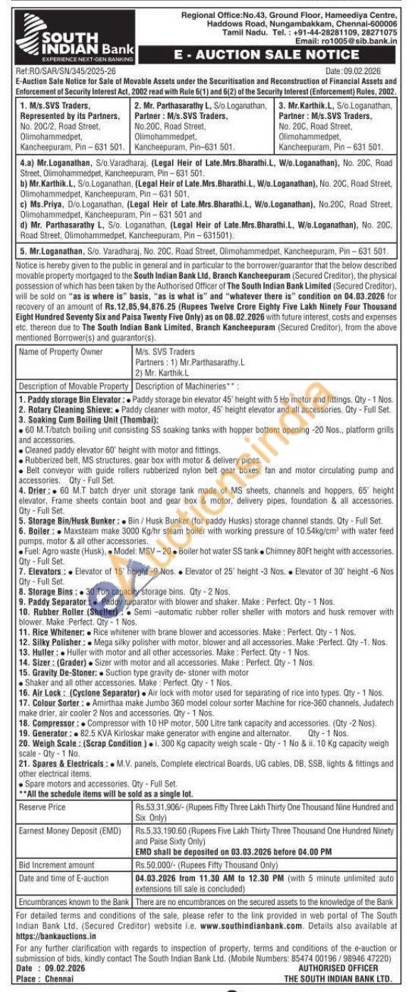 Paddy storage Bin Elevator: Paddy storage bin elevator 45' height with 5 Hp motor and fittings, Qty-1 Nos. 2. Rotary Cleaning Shieve: Paddy cleaner with motor, 45 height elevator and all accessories. Qty-Full Set 3. Soaking Cum Boiling Unit (Thombai): 60 M.T/batch boiling unit consisting SS soaking tanks with hopper bottom opening -20 Nos, platform grills and accessories. Clearned paddy elevator 60' height with motor and fittings Rubberized belt, MS structures, gear box with motor & delivery pipes Belt conveyor with quide roliers rubberized nylon belt gear boxes, fan and motor circulating pump and 4. Drier: 60 MT batch dryer unit storage tank made of MS sheets, channels and hoppers, 165" height accessories. Oty Full Set elevator, Frame sheets contain boot and gear box & motor, delivery pipes, foundation & all accessories. Qty Full Set 5. Storage Bin/Husk Bunker: Bin/Husk Bunker (for paddy Husks) storage channel stands. Oty-Full Set 6. Boiler: Maxsteam make 3000 Kg/hr steam boiler with working pressure of 10.54kg/cm with water feed pumps, motor & all other accessories. Fuel: Agro waste (Husk), Model: MSV-20Boller hot water SS tank Chimney B0Ft height with accessories. Oty Full Set 7. Elevators: Elevator of 15' height -9 Nos Elevator of 25' height-3 Nos. Elevator of 30' height. -6 Nos Dry-Full Set 8. Storage Bins 30 Ton capacity storage bins Qty-2 Nos 9. Paddy Separator: Paddy separator with blower and shaker, Make: Perfect. Oty-1 Nos. 10. Rubber Roller (Sheller): Semi-automatic rubber roller sheller with motors and husk remover with blower, Make Perted Perfect. Qty 1 Nom 12. Silky Polisher: Mega silky polisher with motor, blower and all accessories. Make Perfect. Qty-1. Nos. 11. Rice Whitener: Rice whitener with brane blower and accessories. Make: Perfect. Qty 1 Nos. 13. Huller: Huller with motor and all other accessories, Make: Perfect. Oty-1 Nos. 14. Sizer: (Grader) Sizer with motor and all accessories. Make: Perfect Oly-1 Nos 15. Gravity De-Stoner: Suction type gravity de- stoner with motor 16. Air Lock: (Cyclone Separator) Air lock with motor used for separating of rice into types. Qty-1 Nos Shaker and all other accessories. Make: Perfect. Oty-1 Nos.
