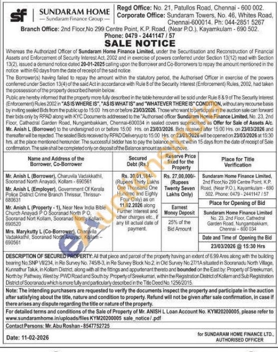 DESCRIPTION OF SECURED PROPERTY: All that piece and parcel of the property having an extent of 6.99 Ares along with the building bearing No. SNP VIV234, in Re Survey No. 745/8-3, in Re Survey Block No.2, in Old Survey No. 27/1A situated in Sooranadu North Village, Kunnathur Taluk, in Kollam District, along with all the fittings and appurtenant thereto and bounded on the East by: Property of Sreekumari, North by: Pathway, West by: PWD Road and South by: Property of Sreekumar, within the Registration District of Kollam and Sub Registration District of Sooranadu which is more fully and particularly described in the Title Deed No. 1256/2015