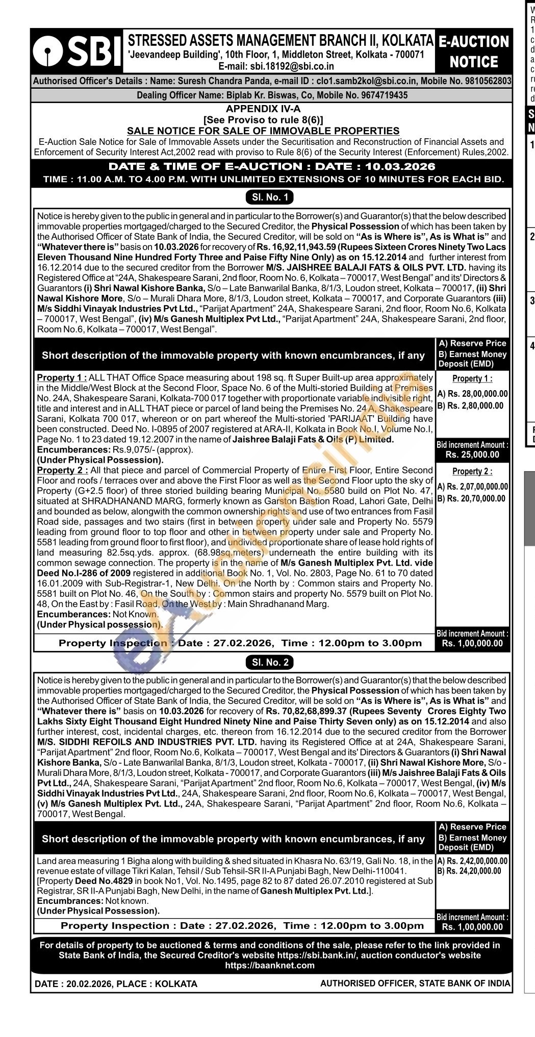 Property 1: ALL THAT Office Space measuring about 198 so I Super Built-up area approximately in the Middle/West Block at the Second Floor, Space No. 6 of the Multi-storied Building at Premises No. 24A, Shakespeare Sarani, Kolkata-700017 together with proportionate variable indivisible right, title and interest and in ALL THAT piece or parcel of land being the Premises No. 24 A, Shakespeare Sarani, Kolkata 700 017, whereon or on part whereof the Multi-storied 'PARIJAAT Building have been constructed. Deed No. 1-0895 of 2007 registered at ARA-Ii, Kolkata in Book No. I, Volume No.I. Page No. 1 to 23 dated 19.12.2007 in the name of Jaishree Balaji Fats & Oils (P) Limited.
