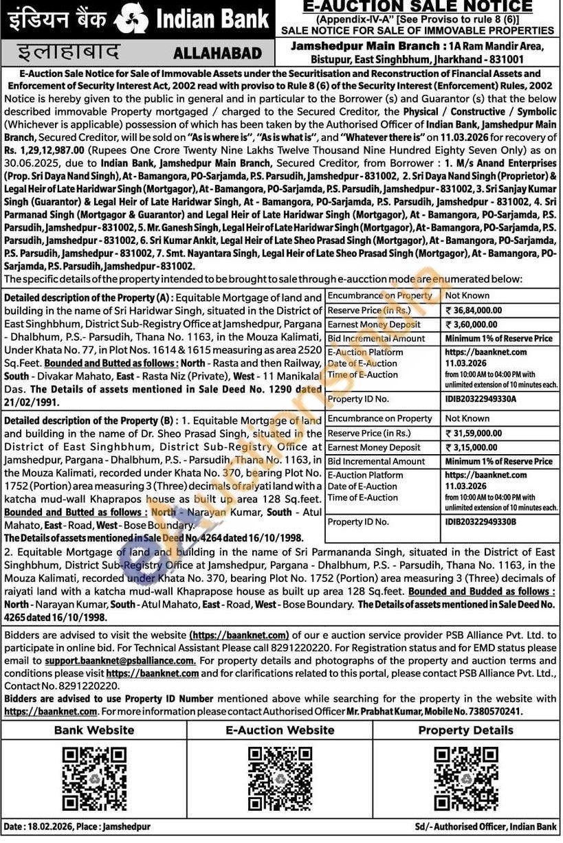 Detailed description of the Property (B): 1. Equitable Mortgage of land and building in the name of Dr. Sheo Prasad Singh, situated in the District of East Singhbhum, District Sub-Registry Office at Jamshedpur, Pargana - Dhalbhum, P.S. - Parsudih, Thana No. 1163, in the Mouza Kalimati, recorded under Khata No. 370, bearing Plot No. 1752 (Portion) area measuring 3 (Three) decimals of raiyati land with a katcha mud-wall Khaprapos house as built up area 128 Sq.feet. Bounded and Butted as follows: North Narayan Kumar, South - Atul Mahato, East-Road, West-Bose Boundary.2. Equitable Mortgage of land and building in the name of Sri Parmananda Singh, situated in the District of East Singhbhum, District Sub-Registry Office at Jamshedpur, Pargana - Dhalbhum, P.S. Parsudih, Thana No. 1163, in the Mouza Kalimati, recorded under Khata No. 370, bearing Plot No. 1752 (Portion) area measuring 3 (Three) decimals of raiyati land with a katcha mud-wall Khaprapose house as built up area 128 Sq.feet. Bounded and Budded as follows: North-Narayan Kumar, South-Atul Mahato, East-Road, West-Bose Boundary. The Details of assets mentioned in Sale Deed No. 4265 dated 16/10/1998.