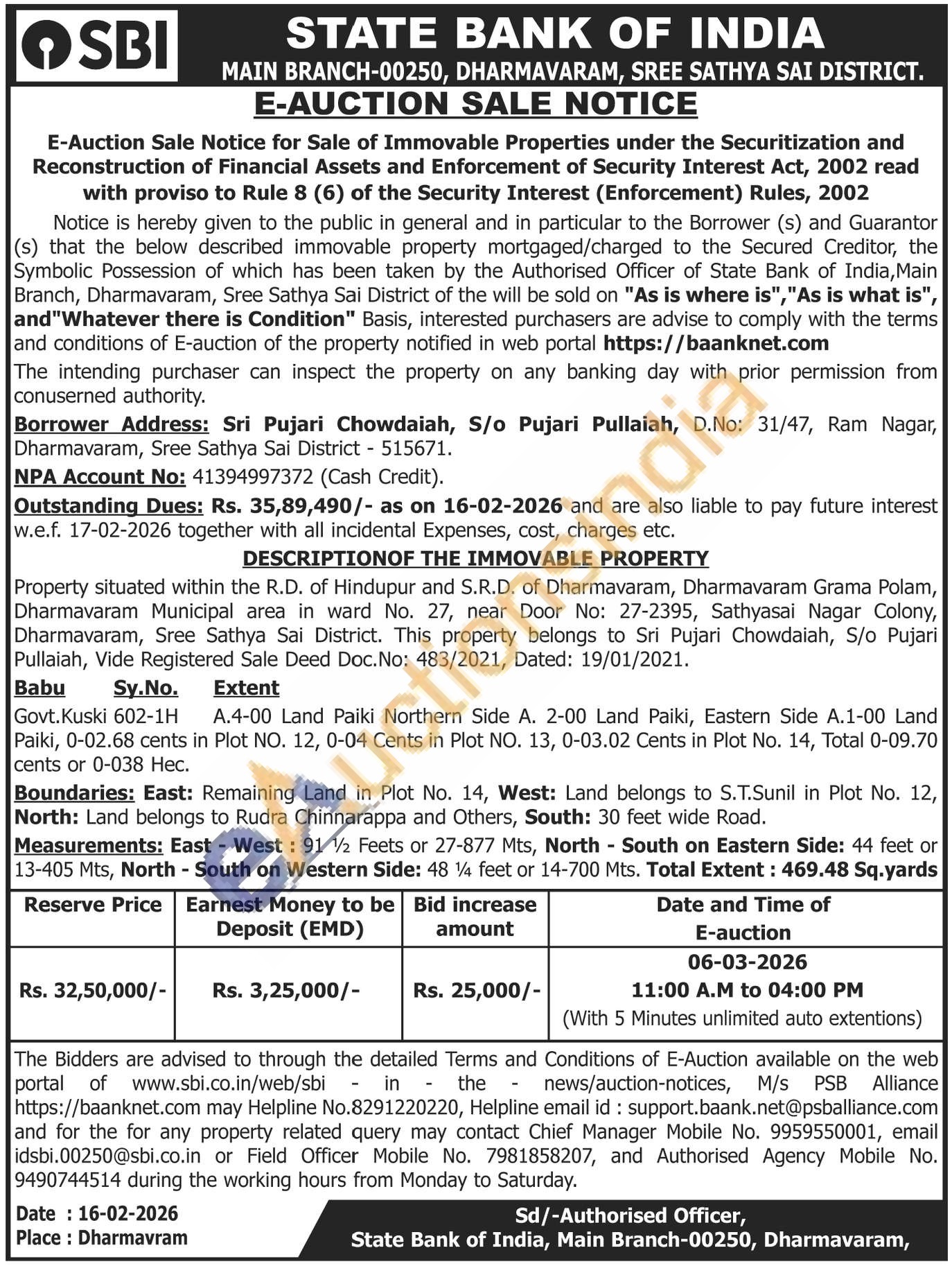 Property situated within the R.D. of Hindupur and S.R.D. of Dharmavaram, Dharmavaram Grama Polam, Dharmavaram Municipal area in ward No. 27, near Door No: 27-2395, Sathyasai Nagar Colony, Dharmavaram, Sree Sathya Sai District. This property belongs to Sri Pujari Chowdaiah, S/o Pujari Pullaiah, Vide Registered Sale Deed Doc. No: 483/2021, Dated: 19/01/2021. Babu Sy.No. Extent Govt. Kuski 602-1H A.4-00 Land Paiki Northern Side A. 2-00 Land Paiki, Eastern Side A.1-00 Land Paiki, 0-02.68 cents in Plot NO. 12, 0-04 Cents in Plot NO. 13, 0-03.02 Cents in Plot No. 14, Total 0-09.70 cents or 0-038 Нес. Boundaries: East: Remaining Land in Plot No. 14, West: Land belongs to S.T.Sunil in Plot No. 12, North: Land belongs to Rudra Chinnarappa and Others, South: 30 feet wide Road. Measurements: East - West: 91 1/2 Feets or 27-877 Mts, North South on Eastern Side: 44 feet or 13-405 Mts, North - South on Western Side: 48 14 feet or 14-700 Mts. Total Extent: 469.48 Sq.yards