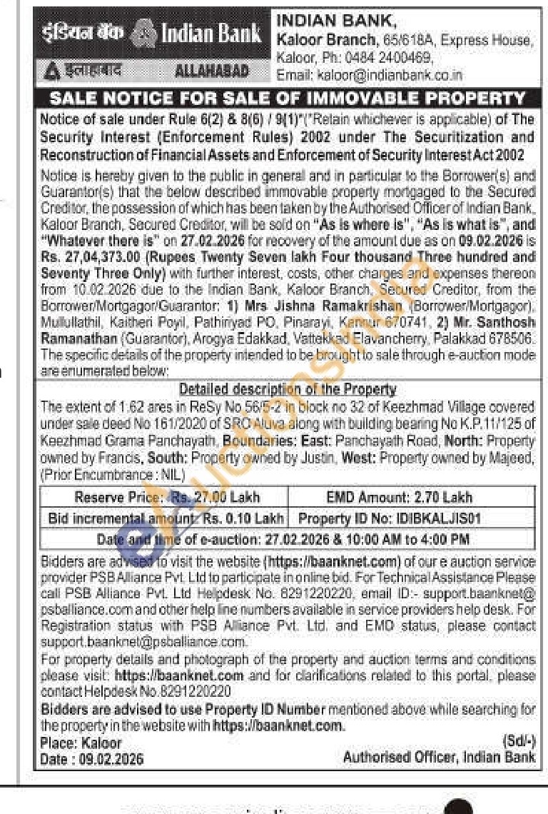 The extent of 1.62 ares in ReSy No 56/5-2 in block no 32 of Keezhmad Village covered under sale deed No 161/2020 of SRO Aluva along with building bearing No K.P. 11/125 of Keezhmad Grama Panchayath, Boundaries: East: Panchayath Road, North: Property owned by Francis, South: Property owned by Justin, West: Property owned by Majeed, (Prior Encumbrance: NIL