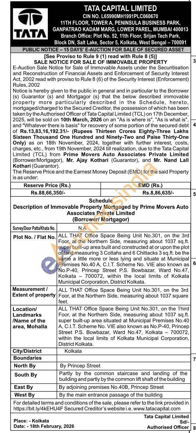 ALL THAT Office Space Being Unit No.301, on the 3rd Foor, at the Northern Side, measuring about 1037 sq.ft. super built-up area built and constructed at or upon the plot of land measuring 3 Cottahs and 6 Chittacks 3 sq.ft. be the same a little more or less lying and situate at Municipal Premises No.40 A, C.I.T. Scheme No. VIE also known as 6 No.P-40, Princep Street P.S. Bowbazar, Ward No.47. Kolkata 700072, within the local limits of Kolkata Municipal Corporation, District Kolkata.