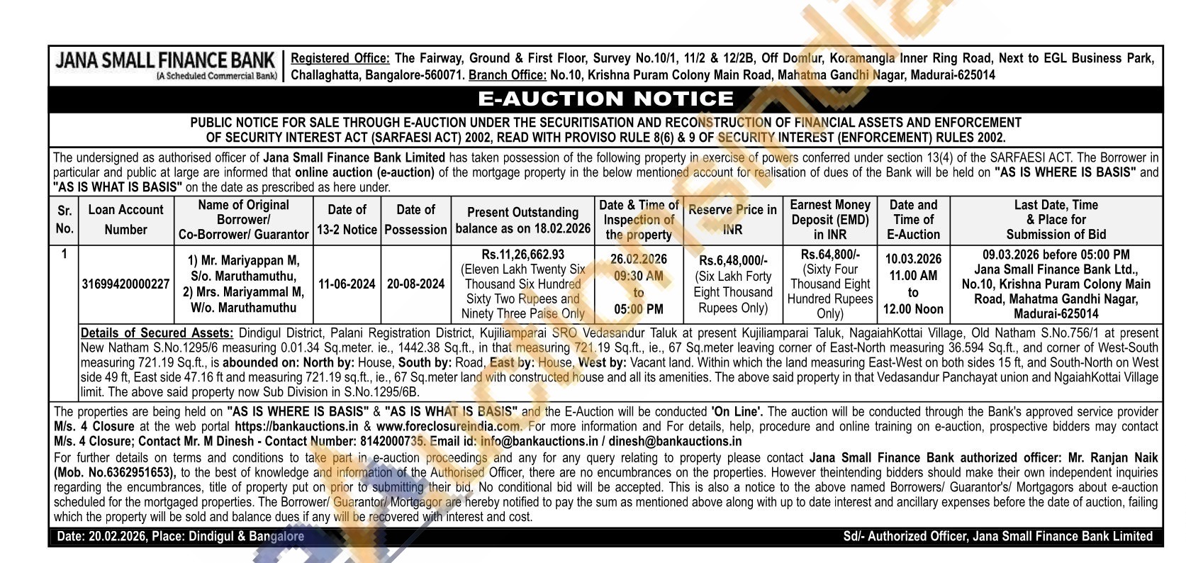 Details of Secured Assets: Dindigul District, Palani Registration District, Kujiliamparai SRO Vedasandur Taluk at present Kujiliamparai Taluk, NagaiahKottai Village, Old Natham S.No.756/1 at present New Natham S.No. 1295/6 measuring 0.01.34 Sq.meter. ie., 1442.38 Sq.ft., in that measuring 721.19 Sq.ft., ie., 67 Sq. meter leaving corner of East-North measuring 36.594 Sq.ft., and comer of West-South measuring 721.19 Sq.ft., is abounded on: North by: House, South by: Road, East by: House, West by: Vacant land. Within which the land measuring East-West on both sides 15 ft, and South-North on West side 49 ft, East side 47.16 ft and measuring 721.19 sq.ft., ie., 67 Sq.meter land with constructed house and all its amenities. The above said property in that Vedasandur Panchayat union and Ngaiah Kottai Village limit. The above said property now Sub Division in S.No. 1295/6B.