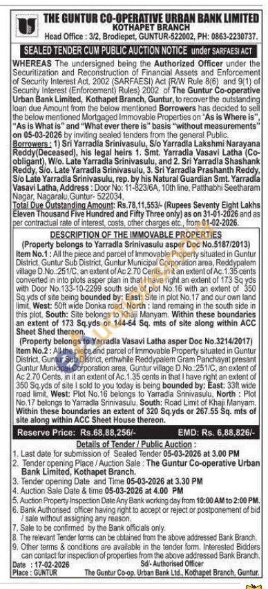 Item No.1: All the piece and parcel of Immovable Property situated in Guntur District, Guntur Sub District, Guntur Municipal Corporation area, Reddypalem village D.No. 251/C, an extent of Ac 2.70 Cents, in it an extent of Ac. 1.35 cents converted in into plots asper plan in that I have right an extent of 173 Sq yds with Door No.133-10-2299 south side of plot No. 16 with an extent of 350 Sq.yds of site being bounded by: East: Site in plot No. 17 and our own land limit, West: 50ft wide Donka road, North: land remaing in the south side in this plot, South: Site belongs to Khaji Manyam. Within these boundaries an extent of 173 Sq.yds or 144-64 Sq. mts of site along within ACC Sheet Shed thereon. (Property belongs to Yarradla Vasavi Latha asper Doc No.3214/2017) Item No.2: All the piece and parcel of Immovable Property situated in Guntur District, Guntur Sub District, erthwhile Reddypalem Gram Panchayat presant Guntur Municipal Corporation area, Guntur village D.No.:251/C, an extent of Ac 2.70 Cents, in it an extent of Ac. 1.35 cents in that I have right an extent of 350 Sq.yds of site I sold to you today is being bounded by: East: 33ft wide road limit, West: Plot No. 16 belongs to Yarradia Srinivasulu, North: Plot No.17 belongs to Yarradla Srinivasulu, South: Road Limit of Khaji Manyam. Within these boundaries an extent of 320 Sq.yds or 267.55 Sq. mts of site along within ACC Sheet House thereon.