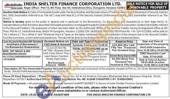 Description Of The Immovable Property/ Secured Asset: All that part and parcel of the property situated at Plot no. 23, Gram Mohabbat Nagar, Sirohi, RAJASTHAN Admeasuring Area About-1375 Sq. Ft.