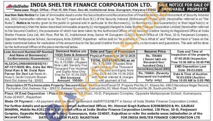 Description Of The Immovable Property/Secured Asset: All Piece And Parcel Of Property Plot No.31, Khasra No. 484/3 Navodaya Nagar Second, Pachpahar, Dist Jhalawar, Raj-326512 Jhalawar Boundary:-East-plot No.30, West-Road, North-plot No.26, South-plot No.28