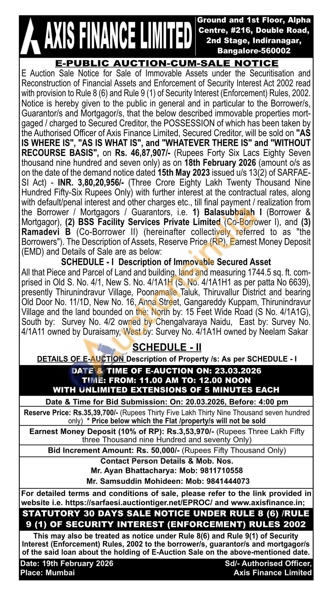 All that Piece and Parcel of Land and building, land and measuring 1744.5 sq. ft. com-prised in Old S. No. 4/1, New S. No. 4/1A1H (S. No. 4/1A1H1 as per patta No 6639), presently Thirunindravur Village, Poonamalle Taluk, Thiruvallur District and bearing Old Door No. 11/1D, New No. 16, Anna Street, Gangareddy Kuppam, Thirunindravur Village and the land bounded on the: North by: 15 Feet Wide Road (S No. 4/1A1G), South by: Survey No. 4/2 owned by Chengalvaraya Naidu, East by: Survey No. 4/1A11 owned by Duraisamy, West by: Survey No. 4/1A1H owned by Neelam Sakar
