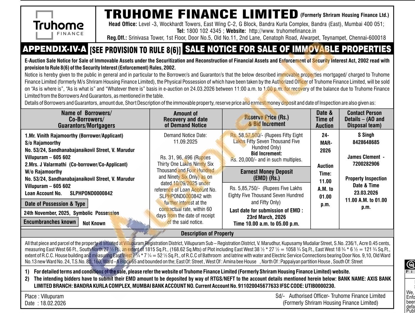 All that piece and parcel of the property is situated at Villupuram Registration District, Villupuram Sub-Registration District, V. Marudhur, Kupusamy Mudaliar Street, S.No. 236/1, Acre 0.45 cents, measuring East West 66 Ft., South North 27% Ft., an extent of 1815 Sq.Ft., (168.62 Sq.Mts) of Plot including East West 38*27/½ 1058% Sq.Ft., East West 18%*6=1214 Sq.Ft., extent of R.C.C. House building and measuring East West 7147452% Sq.Ft., of R.C.C of Bathroom and latrine with water and Electric Service Connections bearing Door Nos. 9,10, Old Ward No. 13 new Ward No. 24, T.S.No. 80, 160, Ward-A Block 65 and bounded on the; East Of: Street, West Of: Amina bee House, North Of: Pappaiyan partition House, South Of: Street