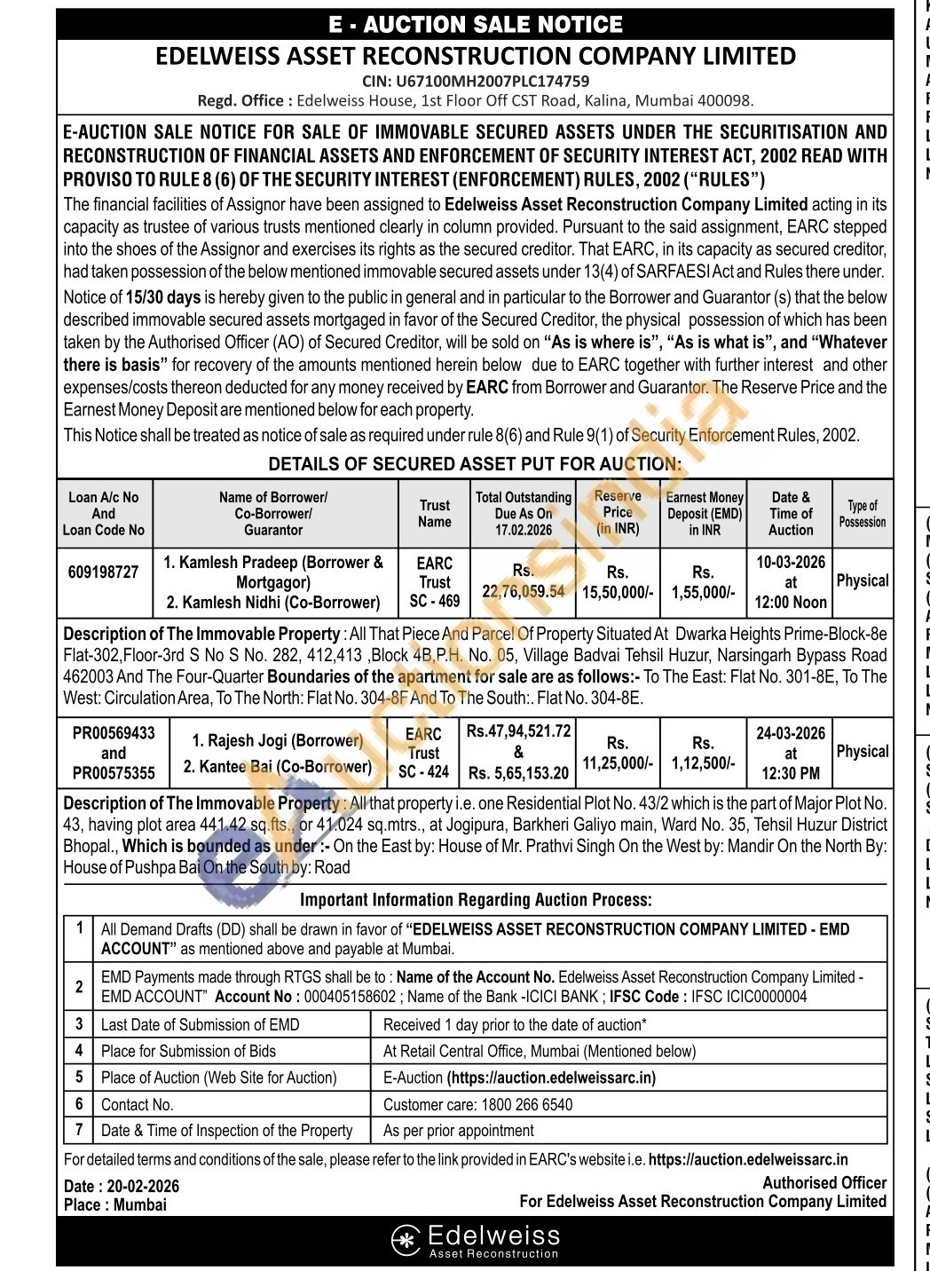 Description of The Immovable Property: All That Piece And Parcel Of Property Situated At Dwarka Heights Prime-Block-8e Flat-302, Floor-3rd S No S No. 282, 412,413, Block 4B, P.H. No. 05, Village Badvai Tehsil Huzur, Narsingarh Bypass Road 462003 And The Four-Quarter Boundaries of the apartment for sale are as follows:- To The East: Flat No. 301-8E, To The West: Circulation Area, To The North: Flat No. 304-8F And To The South:. Flat No. 304-8E.