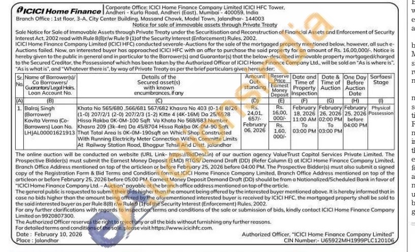 Khata No 565/680,566/681 567/682 Khasra No 403 (0-14) 8//26 (1-0) 207/2/1 (2-0) 207/2/3 (1-2) Kitte 4 (4K-16M) Do 25/6528 Hissa Rakba OK-OM-100 Sqft Vo Khata No 568/683 Number Khasra 209 (3k-4m) Do 45/8704 Hissa Rakbo OK-OM-90 Sqft That Total Area is OK-OM-190sqft on Which Shop Constructed With Running Electricity Meter Connection Within Committe Limits At Railway Station Road, Bhogpur Tehsil And Distt. Jalandhar