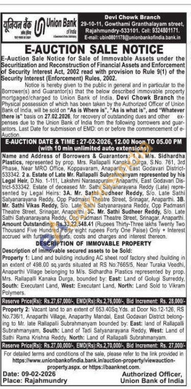 Land and building including AC sheet roof factory shed /building in an extent of 498.00 sq.yards situated at RS No:7665/5, Near Turaka Veedhi, Anaparthi Village belonging to M/s. Sidhardha Plastics represented by prop. Mrs. Rallapalli Kanaka Durga, bounded by: East: Land of Golugi Surreddy, South: Executant Land, West: Executant Land, North: Land Sold to Vikram Polymers.