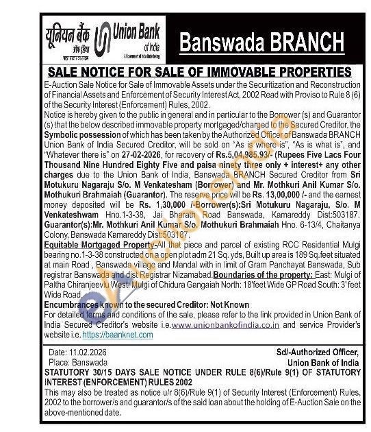 All that piece and parcel of existing RCC Residential Mulgi bearing no.1-3-38 constructed on a open plot adm 21 Sq. yds, Built up area is 189 Sq.feet situated at main Road, Banswada village and Mandal with in limit of Gram Panchayat Banswada, Sub registrar Banswada and dist Registrar Nizamabad Boundaries of the property: East: Mulgi of Paltha Chiranjeevlu West: Mulgi of Chidura Gangaiah North: 18'feet Wide GP Road South: 3' feet Wide Road.