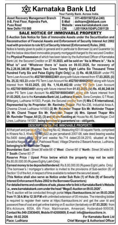 All that part and parcel of Plot, Bearing No 42, Measuring 631.00 square Yards, comprised in Khasra No.3, Khata No. 460/522 as per jamabandi 2007-08, sale deed bearing wasika No.5400 dated 21.07.2016 and wasika No.714 dated 20.04.2010, situated at New Sarabha Nagar Extension, Pakhowal Road, Village Dhandra-2 Basant Avenue, Ludhiana, belonging to Mr. Ravinder Thapar