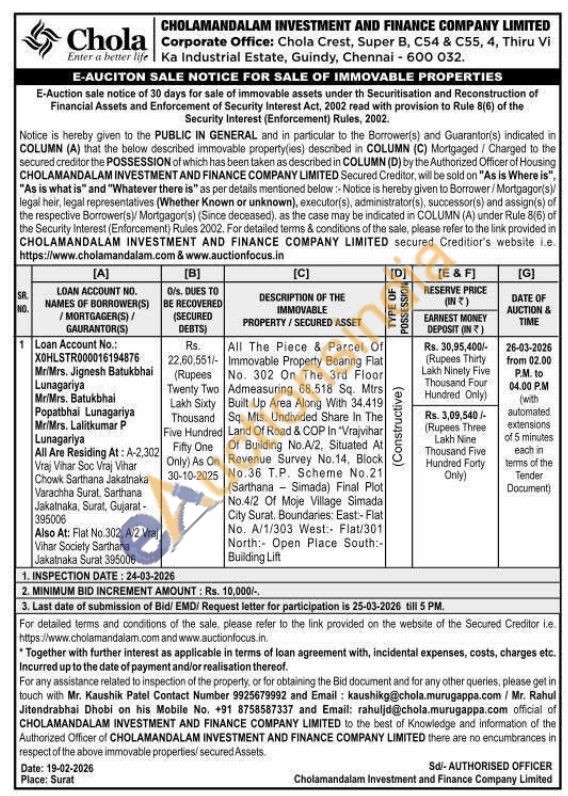 All The Piece & Parcel Of Immovable Property Bearing Flat No. 302 On The 3rd Floor Admeasuring 68.518 Sq. Mtrs Built Up Area Along With 34.419 Sq. Mts. Undivided Share In The Land Of Road & COP In "Vrajvihar Of Building No.A/2, Situated At Revenue Survey No.14, Block No.36 T.P. Scheme No.21 (Sarthana Simada) Final Plot No.4/2 Of Moje Village Simada City Surat, Boundaries: East:-Flat No. A/1/303 West:- Flat/301 North: Open Place South:-Building Lift