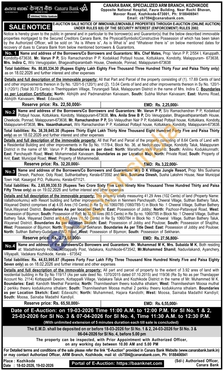 Details and full description of the immovable property; The property totally measuring 41.29 Ares (102 Cents) of land (Property Name: Vallathoorkunnu) with Resort building and further improvements thereon in Nenmeni Panchayath, Cheeral Village, Suithan Bathery Taluk, Wayanad District comprises of a) 4.05 Ares (10 Cents) in Re Sy no.1060/785 (1060/785-1) in Block No:1 Cheeral Village, Sulthan Bathery Taluk, Wayanad District. Boundaries As per location Sketch: East: Possession of Jobby: North: Pazhoor-Pattavayal Road, West: Possession of Bijumon; South: Possession of Rafi; b) 32.59 Ares (80.5 Cents) in Re Sy no. 1060/785 in Block No:1 Cheeral Village, Sulthan Bathery Taluk, Wayanad District and 4.65 Ares (11.50 Cents) in Re Sy 1060/784 in Block No:1 Cheeral Village, Sulthan Bathery Taluk. Wayanad District. Boundaries As per location Sketch: East: Possession of Jobby and Poulose, South: Possession of Shajitha; West: Possession of Bijumon; North: Possession of Sekharan. Boundaries As per Title Deed: East: Possession of Jobby and Poulose: North: Sulthan Bathery-Gudalloor PWD Road, West: Possession of Bijumon; South: Possession of Sekharan