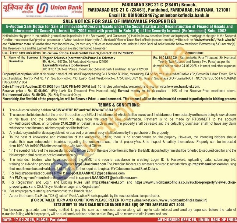 Property Description: All that piece and parcel of Industrial Property having G+1 Storied Building, measuring 134.55 Sq. Yds. situated at Plot No.492, Sector 58, Urban Estate, Teh & Distt Faridabad. North:- Plot No. 491, South:- Plot No. 493, East Road, West:- Plot No. 475 OWNED BY Mr. Yogesh Srivastava S/O Puranlal R/O H. NO: 1697 SEC 55 FARIDABAD HARYANA 121004