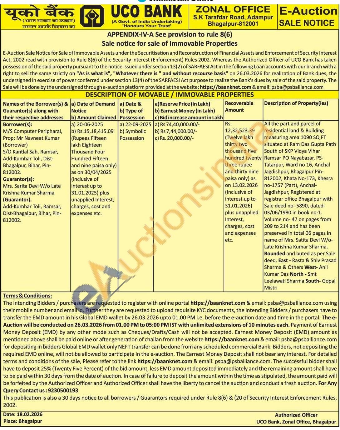 All the part and parcel of residential land & Building measuring area 1090 SQ FT situated at Ram Das Gupta Path South of SKP Vidya Vihar Ramsar PO Nayabazar, PS-Tatarpur, Ward no 16, Anchal Jagdishpur, Bhagalpur Pin-812002, Khata No-173, Khesra no-1757 (Part), Anchal-Jagdishpur, Registered at registrar office Bhagalpur with Sale deed no-5890, dated-03/06/1980 in book no-1. Volume no-47 on pages from 209 to 214 and has been preserved in total 06 pages in name of Mrs. Satita Devi W/o-Late Krishna Kumar Sharma. Bounded and buted as per Sale deed. East - Rasta & Shiv Prasad Sharma & Others West- Anil Kumar Das North - Smt Leelawati Sharma South- Gopal Mistri