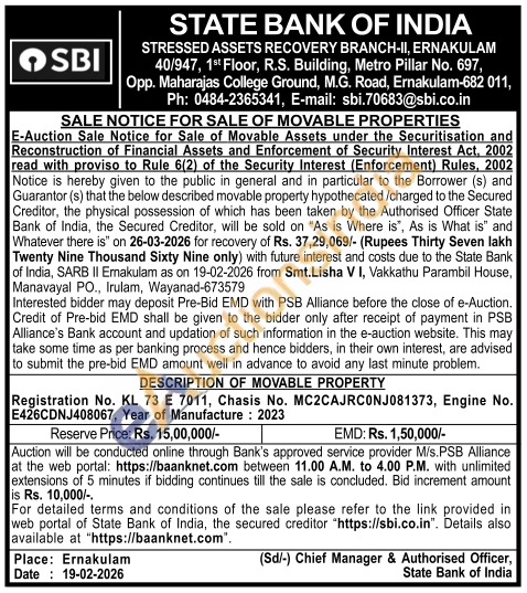 DESCRIPTION OF MOVABLE PROPERTY Registration No. KL 73 E 7011, Chasis No. MC2CAJRC0NJ081373, Engine No. E426CDNJ408067, Year of Manufacture: 2023