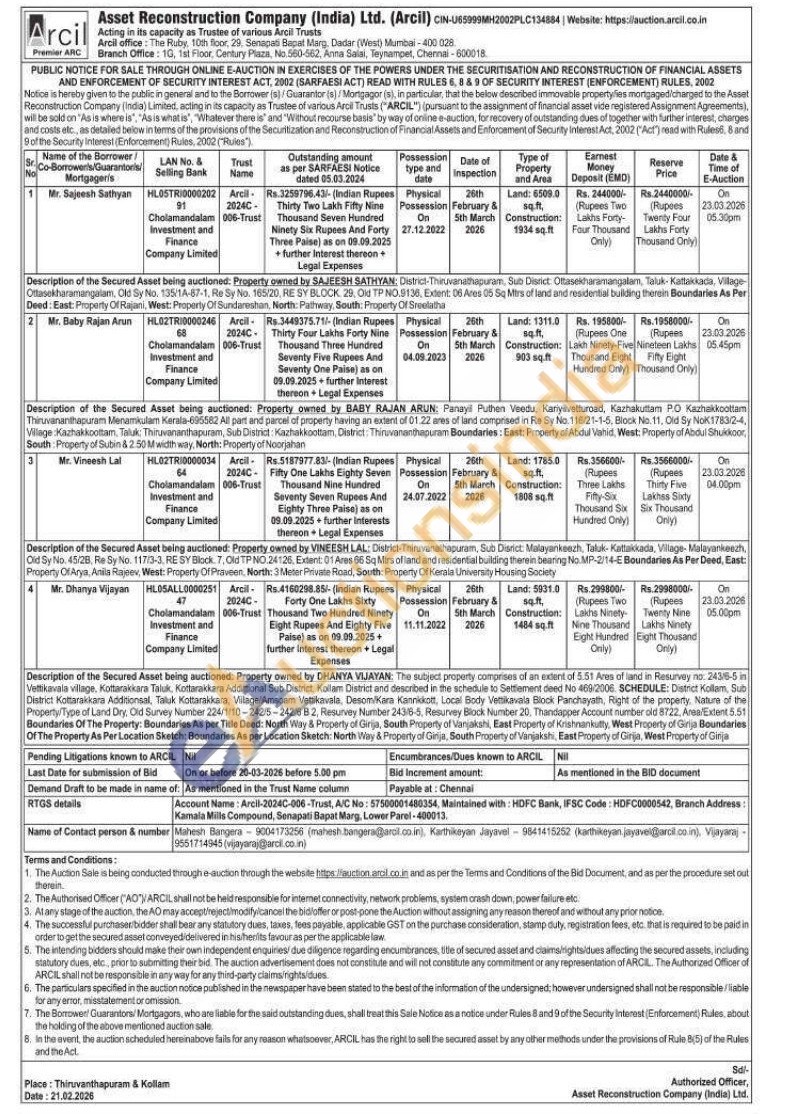 4) The subject property comprises of an extent of 5.51 Ares of land in Resurvey no: 243/6-6 Vettikavala village, Kottarakkara Talk, Kottarakkara Additional Sub District, Kollam District and described in the schedule to Settlement deed No 469/2006. SCHEDULE: District Kollam, Sub District Kottarakkara Additionsal, Taluk Kottarakkara, Vilage Amscam Vettkavala, Desom/Kara Kannkkott, Local Body Vettikavala Block Panchayath, Right of the property. Nature of the Property Type of Land Dry, Old Survey Number 224/1/10-24215-242682, Resurvey Number 2435-5. Resurvey Block Number 20. Thandapper Account number old 8722, Arma/Extent 5.51 Boundaries Of The Property: Boundaries As por Title Deed: North Way & Property of Giria, South Property of Vanjakshi, East Property of Krishnankutty, West Property of Girija Boundaries Of The Property As Per Location Sketch: Boundaries As per Location Sketch: North Way & Property of Girnija, South Property of Vanjakshi, East Property of Girija, West Property of Girja