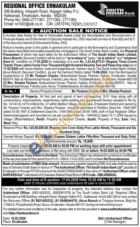 Description of Property: All that part and parcel of land admeasuring 19.51 Ares along with all constructions, improvements, easementary rights existing and appurtenant thereon situated in Re Sy. No. 14/14/3 & 14/15 in Block No. 27 within Mattoor Village, Aluva Taluk, Ernakulam District and owned by Mr. Paulson Chacko and Mrs. Sheeba Paulson, morefully described in Partition Deed No. 1548/1997 dated 03-06-1997 & Settlement Deed No. 3164/1999 dated 29-09-1999, both of Sub Registrar Office-Sreemoolanagaram and bounded on (as per Location Plan No. 1194/04(2) dated 10.11.2004 issued by Village Officer-Mattoor); North: Property of Samson Chacko, South: Property of Roy, East: Way, West: Way