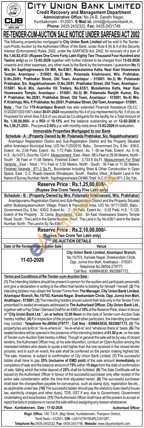 Immovable Properties Mortgaged to our Bank : Schedule - A: (Property Owned by Mr. Polamada Prabhakar, S/o. Nagabhushanam) : Anantapur Registration District and Sub-Registration District and the Property Situated within Anantapur Municipal Area, U/D No.1120/2010, Babu: Government Dry, S.No: 636/2, Extent: Ac. 2-04 Paiki, Extent: Ac. 1-72 Paiki, Extent: Ac. 1-50 ee Paiki, Extent: Ac. 0-18, H.S.: Ac 0-073, Door No. 12/411. Measurement: East-West: 98 1/4Feet or 29.95 Meters, North -South: 38 Feet or 11.58 Meters, Finished Extent: 3,733.5 Sq.Ft. Measurement For Shed Varanda: East-West: 11 1/2 Feet or 3.50 Meters, North-South: 38 Feet or 11.58 Meters. Finished Varanda: 871.2 Sq.Ft., Boundaries including Shed & Other Construction in Open Space, East: C.C. Roads towards Shivalayam, South: Rastha, West: B.Badiri Land in the Name of Survey Number, North: Sapthagireshwara Oil Mill. Total: A.C.0.18 (or) 871.2 Sq. Yds