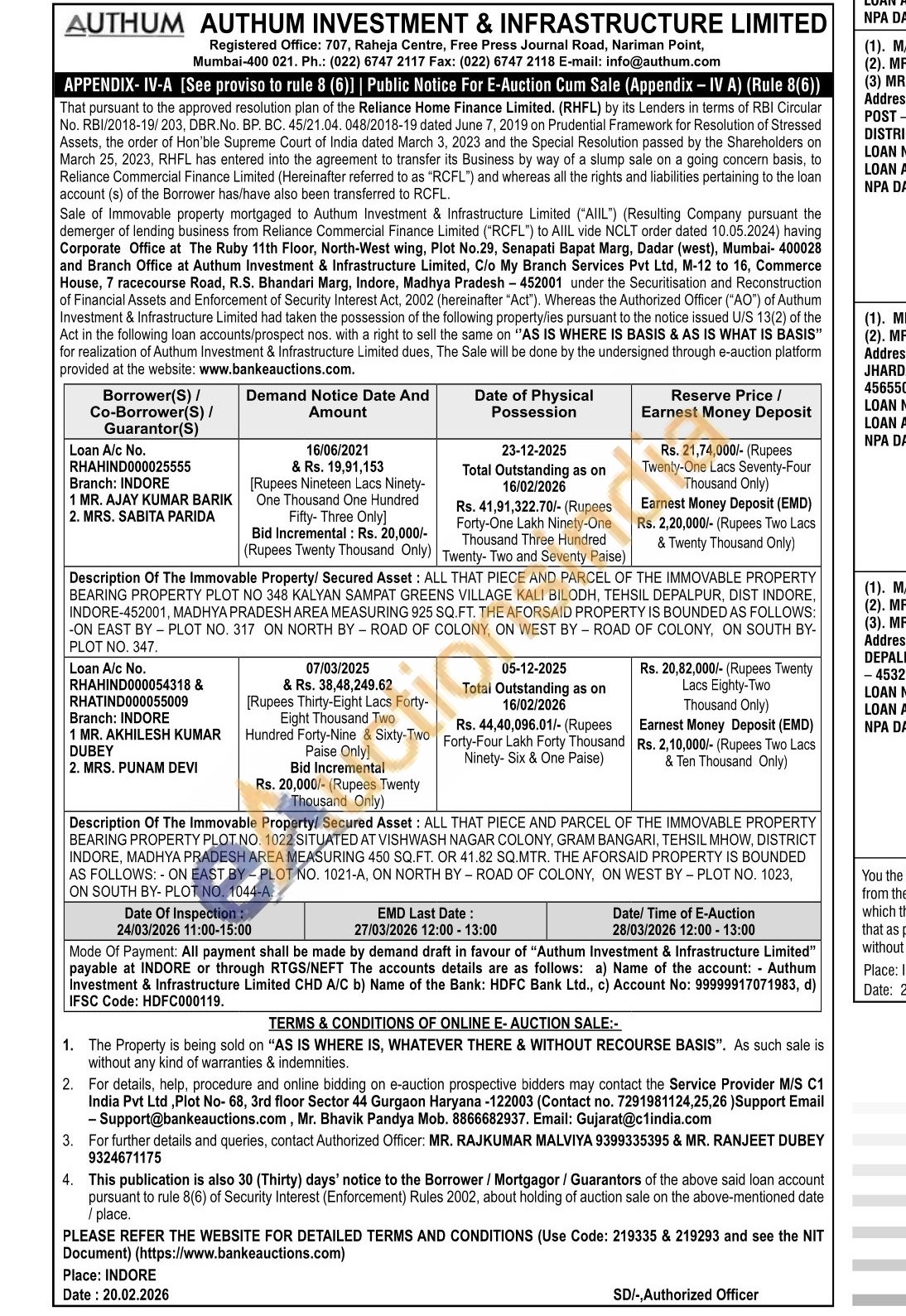 Description Of The Immovable Property/ Secured Asset: ALL THAT PIECE AND PARCEL OF THE IMMOVABLE PROPERTY BEARING PROPERTY PLOT NO 348 KALYAN SAMPAT GREENS VILLAGE KALI BILODH, TEHSIL DEPALPUR, DIST INDORE, INDORE-452001, MADHYA PRADESH AREA MEASURING 925 SQ.FT. THE AFORSAID PROPERTY IS BOUNDED AS FOLLOWS: -ON EAST BY PLOT NO. 317 ON NORTH BY ROAD OF COLONY, ON WEST BY ROAD OF COLONY, ON SOUTH BY-PLOT NO. 347.