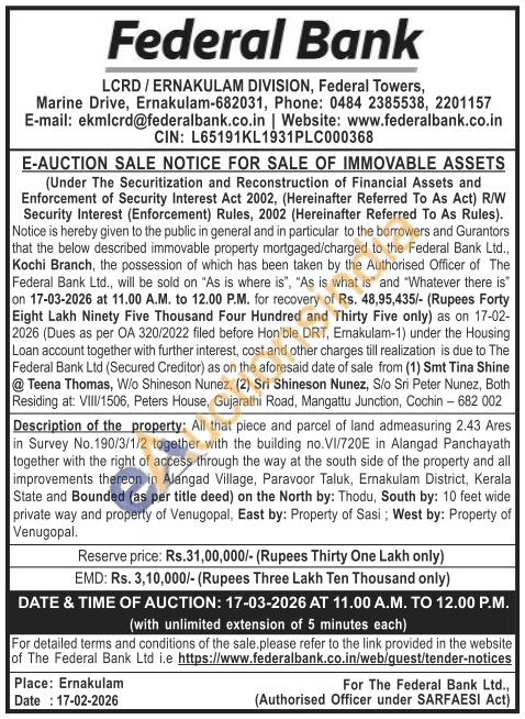 in Survey No. 190/3/1/2 together with the building no.VI/720E in Alangad Panchayath together with the right of access through the way at the south side of the property and all improvements thereon in Alangad Village, Paravoor Taluk, Ernakulam District, Kerala State and Bounded (as per title deed) on the North by: Thodu, South by: 10 feet wide private way and property of Venugopal, East by: Property of Sasi; West by: Property of Venugopal