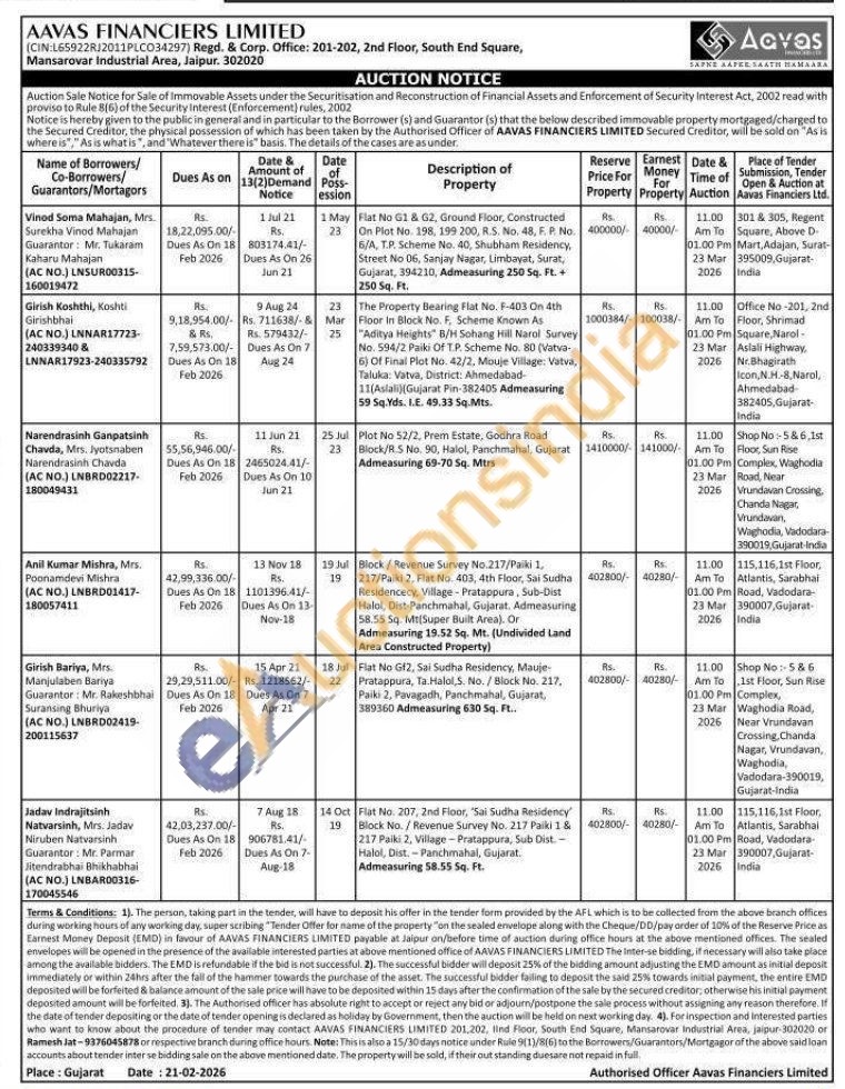 The Property Bearing Flat No. F-403 On 4th Floor in Block No. F. Scheme Known As "Aditya Heights" B/H Sohang Hill Narol Survey No. 594/2 Paiki Of T.P. Scheme No. 80 (Vatva-6) Of Final Plot No. 42/2, Mouje Village: Vatva, Taluka: Vatva, District: Ahmedabad-11(Aslali)(Gujarat Pin-382405 Admeasuring 59 Sq. Yds. I.E. 49.33 5q.Mts.