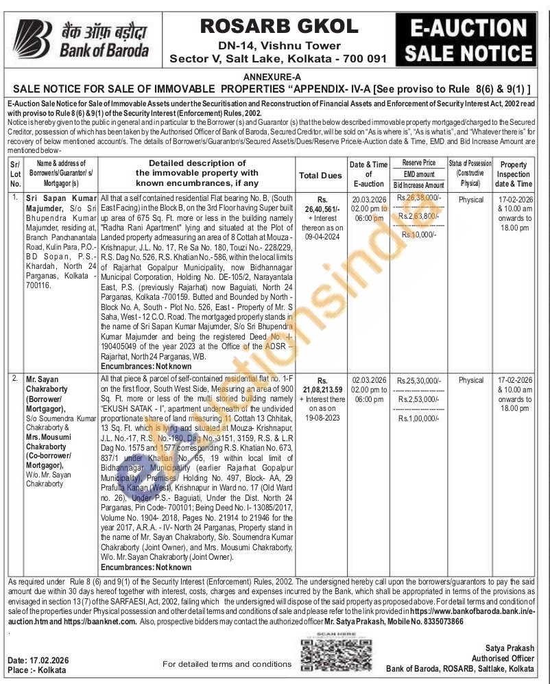 All that a self contained residential Flat bearing No. B, (South Sri East Facing) in the Block B, on the 3rd Floor having Super built Kumar up area of 675 Sq. Ft. more or less in the building namely at, "Radha Rani Apartment" lying and situated at the Plot of Landed property admeasuring an area of 8 Cottah at Mouza -P.O.- Krishnapur, J.L. No. 17, Re Sa No. 180, Touzi No.- 228/229, P.S. R.S. Dag No. 526, R.S. Khatian No.-586, within the local limits 24 of Rajarhat Gopalpur Municipality, now Bidhannagar Municipal Corporation, Holding No. DE-105/2, Narayantala East, P.S. (previously Rajarhat) now Baguiati, North 24 Parganas, Kolkata -700159. Butted and Bounded by North -Block No. A, South - Plot No. 526, East Property of Mr. S Saha, West-12 C.O. Road. The mortgaged properly stands in the name of Sri Sapan Kumar Majumder, S/o Sri Bhupendra Kumar Majumder and being the registered Deed No. -1-190405049 of the year 2023 at the Office of the ADSR -Rajarhat, North 24 Parganas, WB,