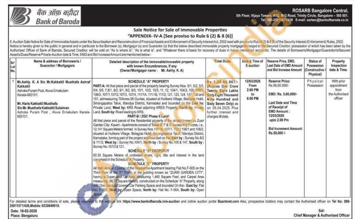 PART-A: All that piece and parcel of the property bearing Survey Nos. 5/1, 5/2, 5/3. 5/4, 5/5, 7,8/1, 8/2, 9/1, 92, 93, 10/1, 10/2, 10/3, 11, 12, 104/1, 104/2, 105, 106/1, 106/2, 107/1,107/2,107/3, 107/4, 111/14, 111/18, 111/2, 121, 123, 124, 147, 150 and 151, admeasuring 70Acres 06 Guntas, situated at Hulikere Village, Belagola Hobli, Srirangapatna Taluk, Mandya District, Kamataka and bounded on the East by: Private Land; West by: KRS Road adjoining KRES Property, North by: Private Land, South by: Road leading to KRS. All that piece and parcel of the Residential property of the project known as Zuari Garden City-Kaveri-Apartments consist of Tower E, F & G, measuring 3 Acres, ie. 12,141 Square Meters formed in Survey Nos. 111/1A, 107/1, 107/2 106/1 and 106/2, situated at Hulikere Village. Belagola Hobli, Srirangapatna Taluk, Mandya District, Kamataka, forming part of the project and bounded on the East by: Survey No 8/2 & 111/2, West by: Survey No. 104/1, North by: Survey No.105 & 147, South by: Survey No. 107/3 & 121. SCHEDULE "B" PROPERTY 50.35 Square Meters of undivided share, right, title and interest in the land comprised in the Schedule 'A'Property. SCHEDULE "C" PROPERTY All that piece and parcel of the Residential Apartment bearing Flat No.F-005 on the Third Floor in the "F" Tower, in the building known as "ZUARI GARDEN CITY", having a Super Built Up Area measuring 1,460 Square Feet, and Carpet Area measuring 99:77 Square Meters, constructed on the Schedule "A" Property, along with One Garage/Covered Car Parking Space and bounded On the:- East by: Flat No. F-006, West by: Open Space, North by: Flat No. F-004, South by: Open Space
